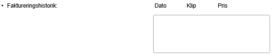 | Faktureringshistorik | En oversigt over hvornår der er købt klip, antallet af klip samt prisen for disse |