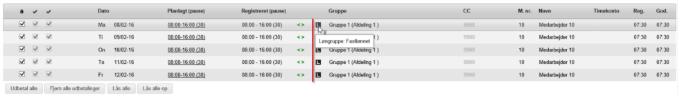 Når denne systemopsætning er aktiveret, kan du ved mouseover på ikonet ”L” se vagtens løngruppe i Timeregistrering.