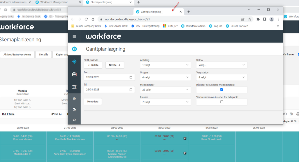 Eksempel: Arbejder du i Skemaplanlægning og ønsker at åbne et nyt faneblad med Ganttplanlægning.