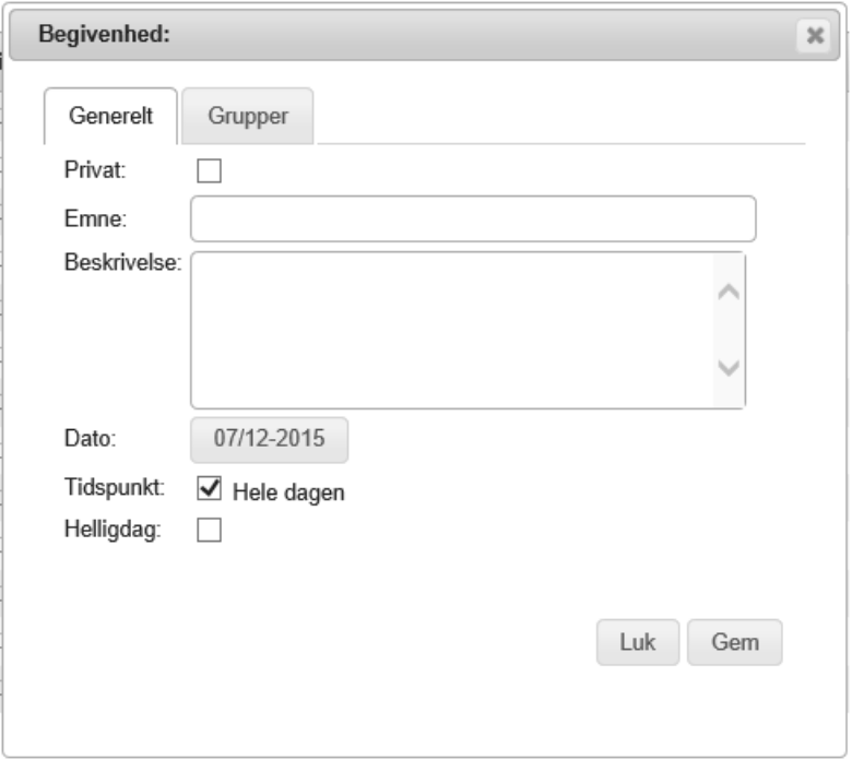 | Privat | Afkrydses hvis begivenheden ikke skal ses af andre end én selv. Fanebladet Grupper åbnes ikke hvis denne er afkrydset. Har man ikke rettigheder til at oprette for egen eller alle afdelinger, vil Privat være afkrydset ved oprettelse |