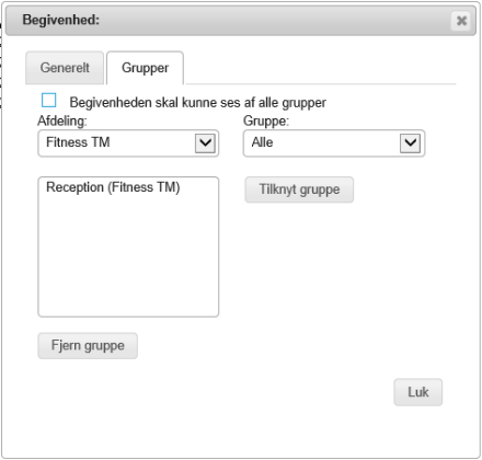 | Fjern gruppe | Mulighed for at vælge at fjerne en specifik gruppe, som ikke skal kunne se begivenheden. Marker gruppen der skal fjernes og tryk herefter på Fjern gruppe |