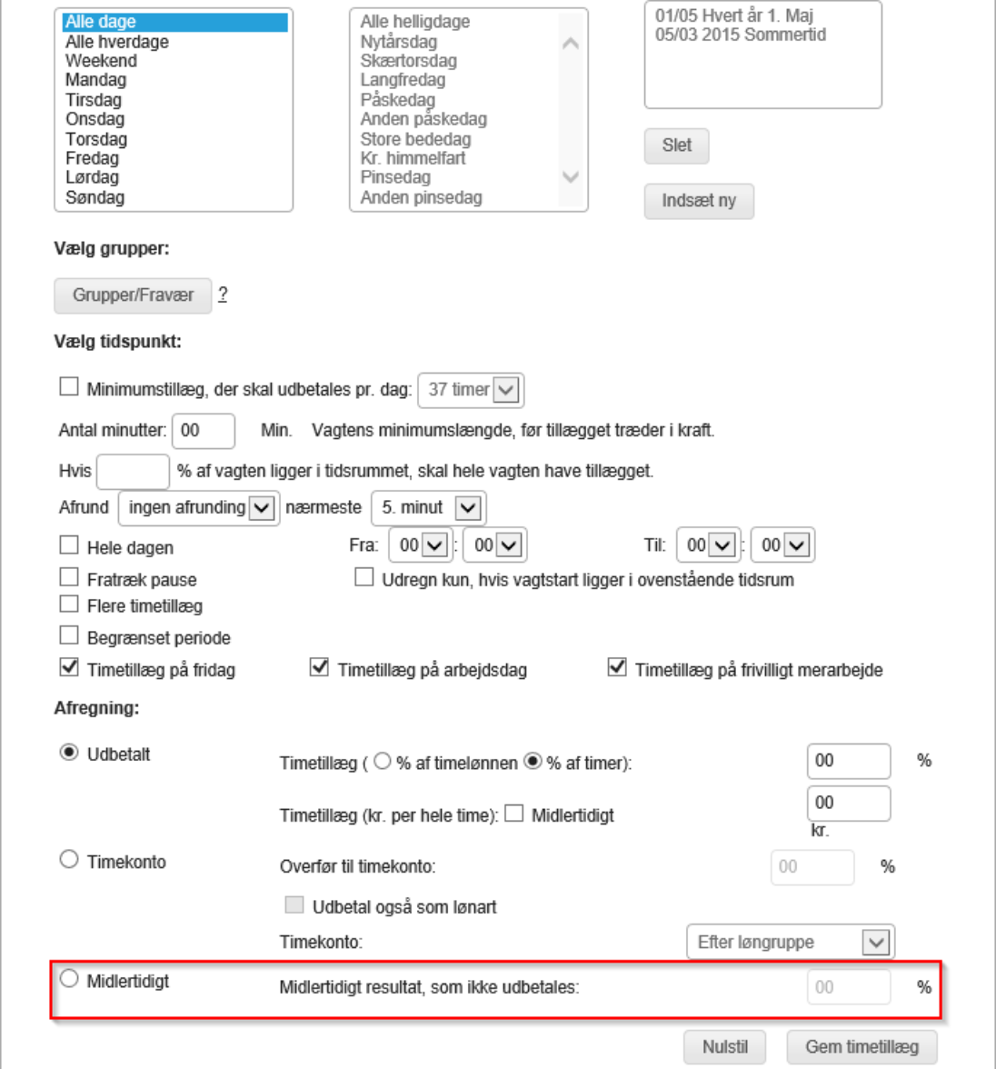 Ved Midlertidig forstås, at tillægget ikke vises i eks. Timeregistrering, og ikke bliver sendt til lønsystemet. Ved opbygning af beregningen, er det en god ide, at tjekke om der beregnes på de korrekte timer, ved at sætte Midlertidigt til Udbetalt.