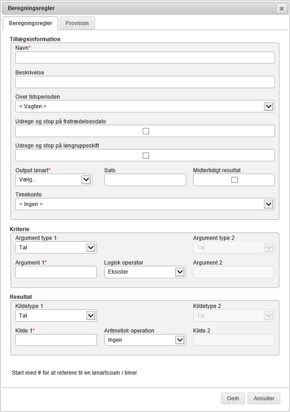 | Kilde 1* | Selve beregningen, hvor der kan henvises til en lønart (husk at foranstille med #), eller sættes en værdi. Det er også muligt, at beregne videre på værdien i dette felt, benyt en ”Aritmetisk operation” (Regneregel) | |