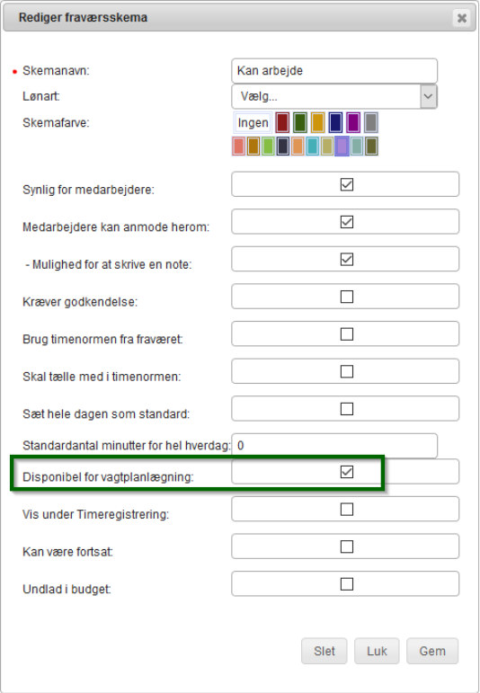 | Disponibel for vagtplanlægning | Normalt, hvis du er fraværende, er du ikke til rådighed i visningen i Skemaplanlægning/Ganttplanlægning og du bør derfor ikke sætte flueben i dette felt på de fleste fraværsårsager. Men du kan have en årsag, fx ”Kan arbejde”, som du markerer som disponibel. Når medarbejdere har lagt denne fraværsårsag ind, vil de blive vist som værende disponibel for at tage vagter og der opstår derfor ikke en konflikt, når du indsætter dem på en vagt den dag. |