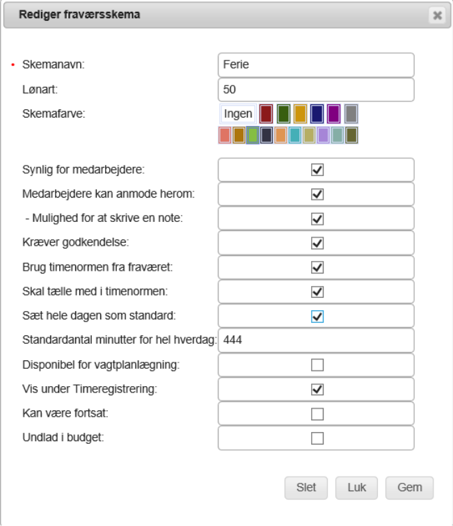 | Skemafarve | Vælg farve på det enkelte fraværsskema. |