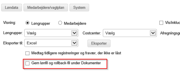 Sæt hak i: ”Gem lønfil og rollback under Dokumenter” inden der trykkes på Eksporter.