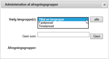 Under ”Vælg løngrupper” vælges de løngrupper, der skal samles i en afregningsgruppe.