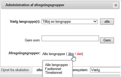 Hold musen over ”åbn” på en gemt afregningsgruppe og se de valgte løngrupper.