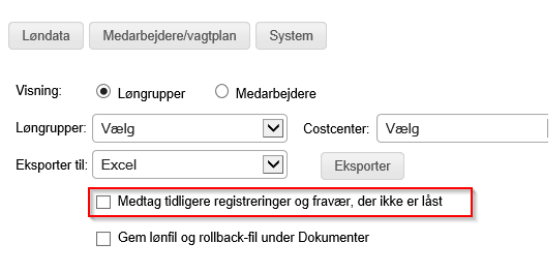 Dette gøres ved at sætte flueben i ”Medtag tidligere registreringer og fravær der ikke er låst”.