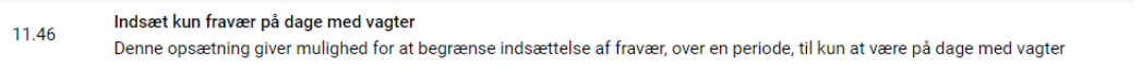 Bemærk hvis systemopsætning 11.46 er aktiveret vil fravær over en periode kun blive indsat på dage hvor der i forvejen ligger en planlagt vagt.