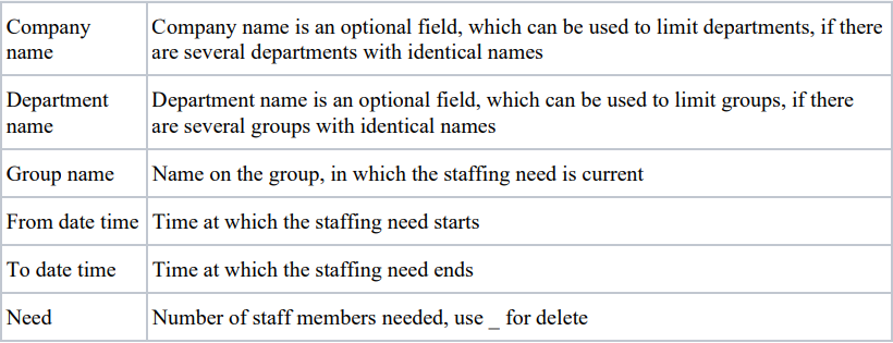 The staffing need must be send as a POST containing: company name;department name;group name;from date time;to date time;need