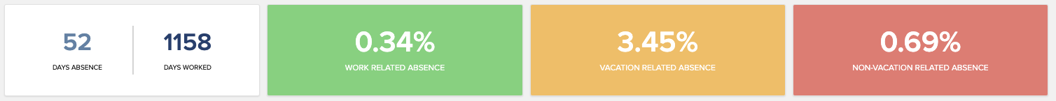 Sygdomsrelateret fravær i procent: Viser procentdelen af fraværsdage, der er tildelt som "Fravær". Antal timer relateret til fraværsregistrering med den samme registrering med fraværstypen "Fravær", divideret med det samlede antal timer, der potentielt er arbejdet i samme periode x 100
