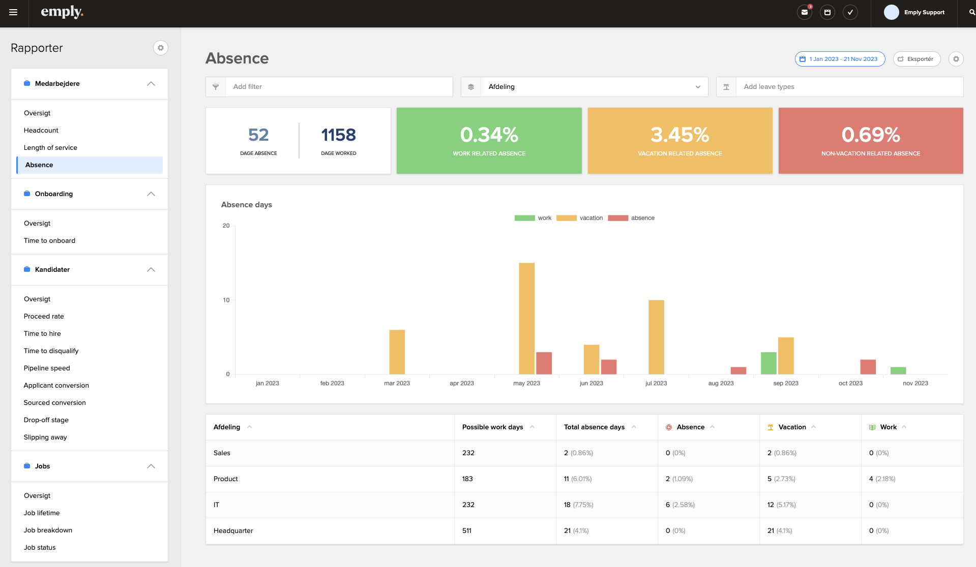 Fraværsdage: Antal godkendte fraværsdage. Alle registrerede dage for alle medarbejdere i en bestemt periode og filter med alle typer Fravær, Arbejde og Ferie