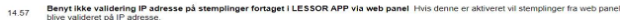 Benyttes fast IP-adresser til stempling via Web-panelet, samtidig med at medarbejdere stempler på Web-panelet via LESSOR-APP, er det muligt at undgå at medarbejderne skal være på en tilladt IP-adresse for at kunne stemple. Det gøres ved at aktivere systemopsætning 14.57: