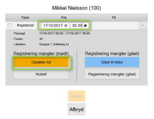 For at kunne redigere tiden, skal medarbejderen vælge den årsag, der giver mulighed for at angive et tidspunkt, hvorefter tidspunktet angives for oven. Efter tidspunktet er angivet, trykkes der på ”opdater tid”: