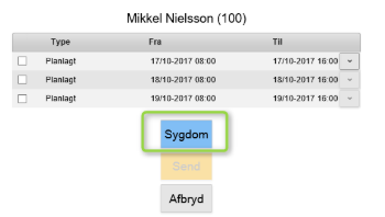 Er muligheden for at redigere tiden aktiveret, får medarbejderen efter tryk på Syg muligheden for at vælge dato og klokkeslæt.