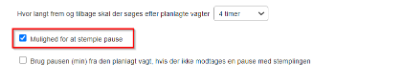 Den anden måde at stemple til pause på er at tage udgangspunkt i den planlagte vagts pause på fx 30 minutter. Med denne opsætning bliver det muligt for medarbejderen kun at skulle trykke på knappen Pause start/ stop (30 min) – så vil stemplingen automatisk oprette en pause på 30 minutter (eller på det antal minutter, som ligger på den planlagte vagt). For at gøre brug af denne mulighed, skal nedenstående flueben sættes på