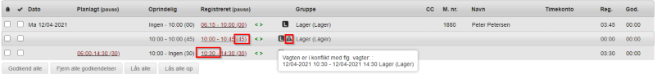 Der vil automatisk blive oprettet en ny registrering med fra-tidspunkt hvor pausen blev påbegyndt og et til-tidspunkt 30 minutter efter (eller det antal minutter der ligger på den planlagte vagt). Pausen fra den planlagte vagt vil fremgå i parentesen på registreringen: