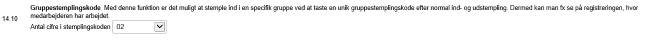 Ønsker virksomheden at benytte muligheden for at medarbejderen kan eller skal stemple ind med Gruppestemplingskode, skal det aktiveres under Opsætning, System: systemopsætning 14.10