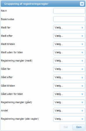 | Mødt til tiden | Hvilke regler (årsager) skal det være muligt at vælge når en medarbejder møder til tiden. En medarbejder møder til tiden, hvis han/hun stempler ind inden for det tidsrum, som er angivet på registreringsgruppen. Her vil der oftest ikke vælges noget |