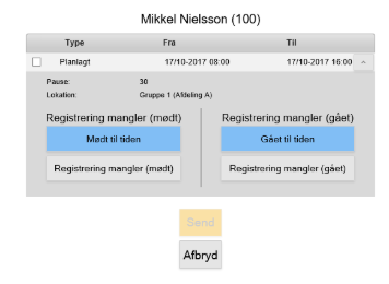 | Registrering mangler | Benyttes, hvis medarbejderen skal håndtere alle tidligere vagter, hvor der mangler registreringer på én gang (i stedet for at angive for Registrering mangler (mødt) og Registrering mangler (gået)). Medarbejderen registrerer således, at han/hun er kommet og gået til tiden alle de dage hvor der mangler registreringer.