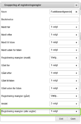 Ønskes mulighed for at lægge en fraværsårsag ind på flere vagter på én gang, kan fraværsårsagen tilføjes under reglen Registrering mangler (alle vagter):