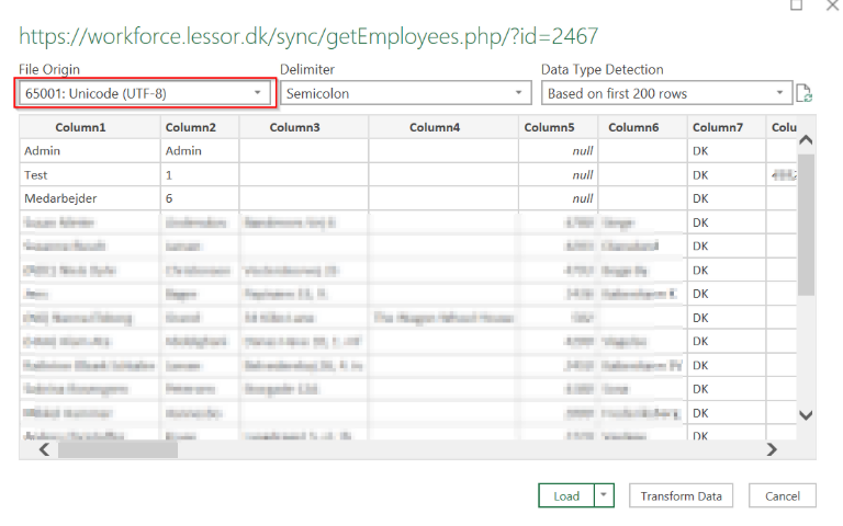 = Csv.Document(Web.Contents(“https://workforce.lessor.dk/sync/getEmployees.php/?id=2445”),[Delimiter=";", Encoding=65001])