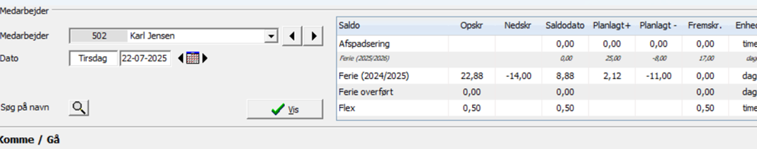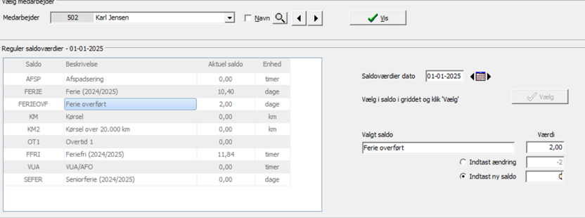 I nedenstående eksempel er der fejlagtigt overført 2 feriedage fra foregående år, som man derfor gerne vil regulere væk.
