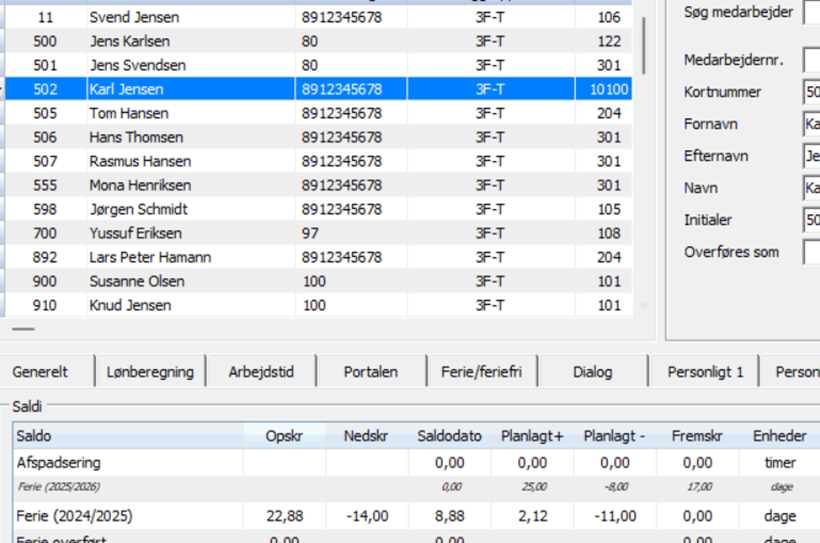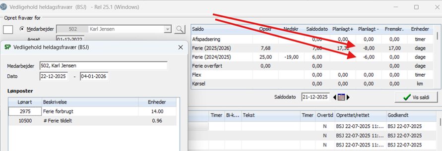 Medarbejder 502 Karl Jensen har allerede planlagt såvel efterårsferie som 14 dages juleferie. For at have nok dage til juleferien, trækker SPTID de manglende dage fra den nye saldo 2025/2026, der vil blive tildelt 1. september.