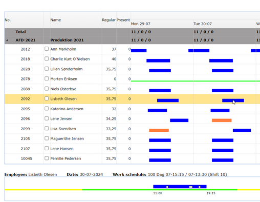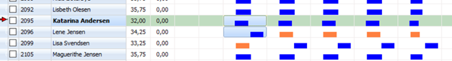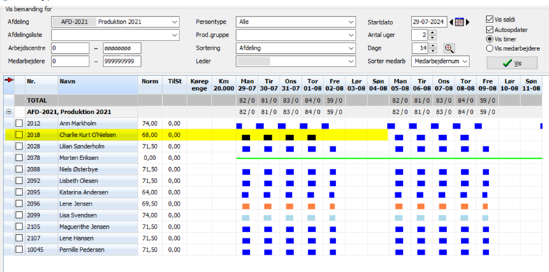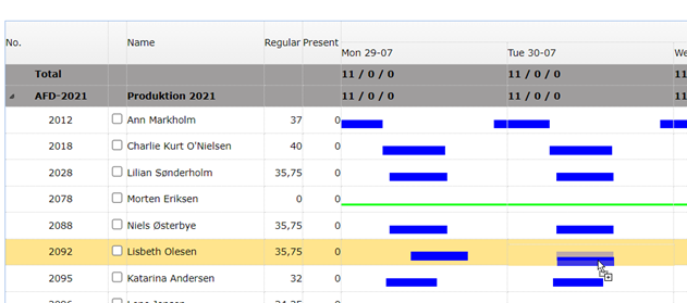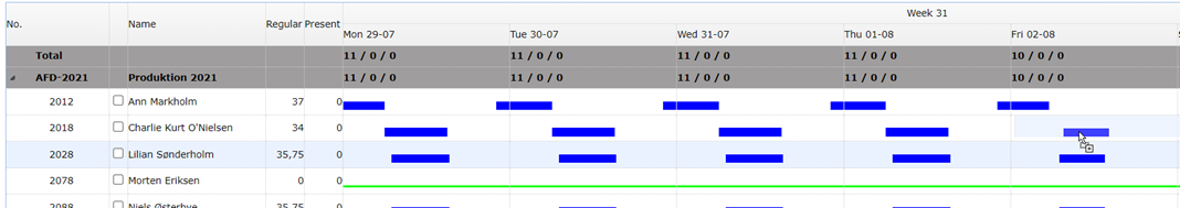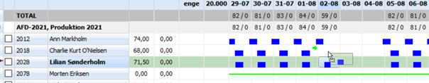 Hvis Charlie i stedet skal overtage medarbejder 2028 Lilian Sønderholms vagt den samme fredag, markeres i stedet fredagen ud for Lilian, og den trækkes op på Charlie: