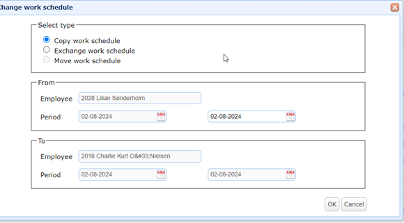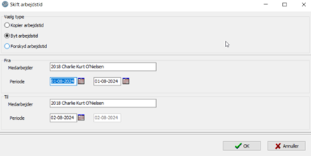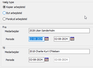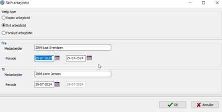 Det er muligt at bytte arbejdstid mellem 2 medarbejdere. I følgende eksempel bytter medarbejder 2096 Lene Jensen, der arbejder på daghold med 2099 Lisa Svendsen, der arbejder på aftenhold.