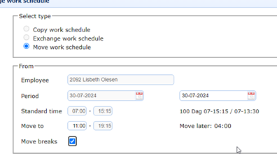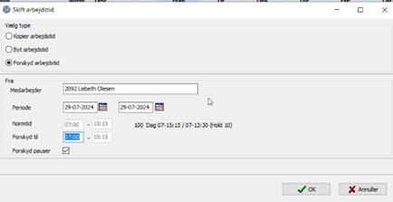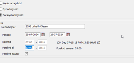 Du kan også lave forskydning af arbejdstid via drag and drop. Tag fat i dagen og træk en anelse mod højre: