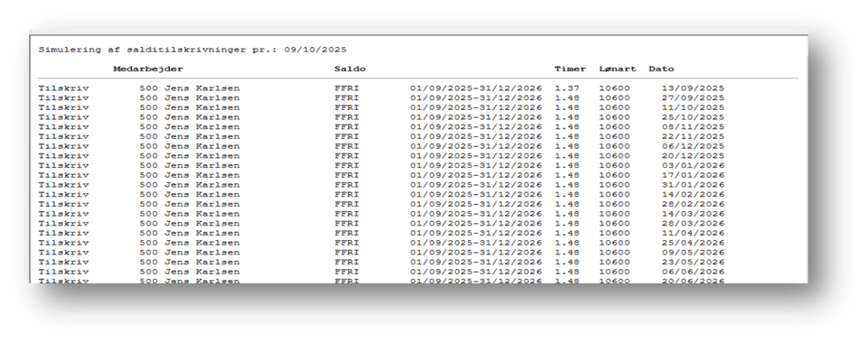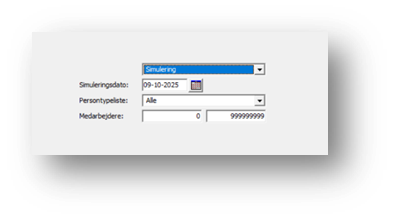 Angiv datoen, du ønsker at simulere. Der kan simuleres for alle medarbejdere, eller for en udvalgt persontype og / eller et udvalgt medarbejderinterval. Det kan være en fordel at foretage simuleringen for få medarbejdere for at få et bedre overblik,