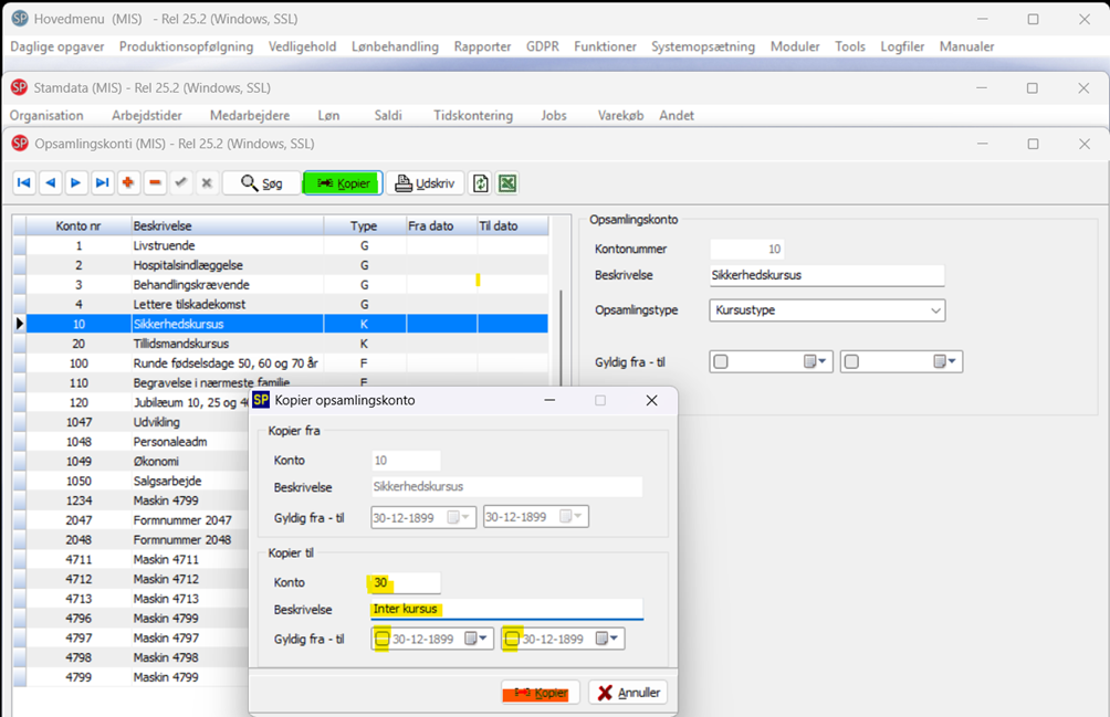 Udfyld konto med et nummer, der ikke findes. Påfør Beskrivelse og fjern flueben i Gyldig fra – til felterne og tryk Kopier (rød).