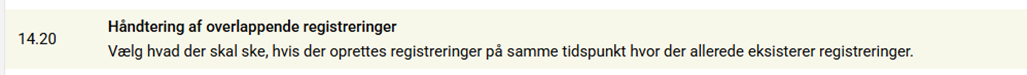 Systemopsætning 14.20 er en eksisterende systemopsætning som bruges til at angive hvad man ønsker der skal ske hvis en medarbejder forsøger at oprette en registrering med overlap. Der er overlap hvis medarbejderen forsøger at oprette en registrering på en dag og i et tidsrum, hvor der helt eller delvist eksisterer registreringer (inkl. fravær) i forvejen.