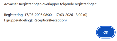 Når systemopsætningen står til ”Advarsel ved overlappende registreringer”, vil det være muligt både i app og browser at lave registreringer, der overlapper hinanden, men der vil komme en advarsel som denne.