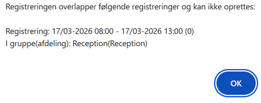 Når systemopsætningen står til ”Tillad ikke overlappende registreringer” vil det ikke være muligt at lave registreringer der overlapper hinanden, men der vil komme en advarsel som denne.