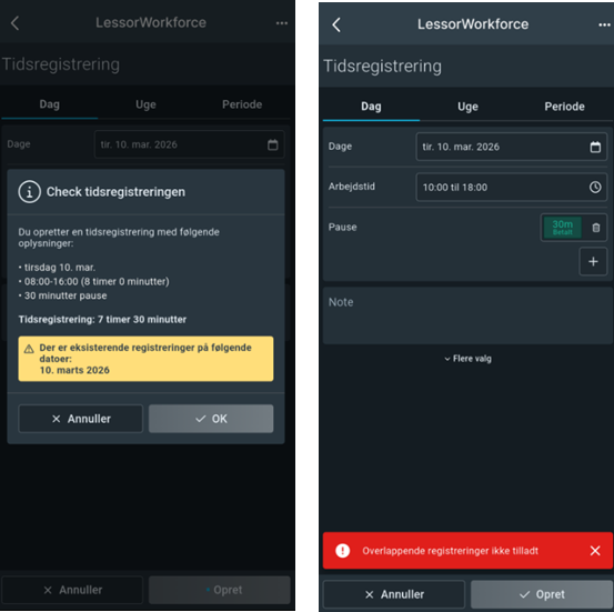 Valget af systemopsætning 14.20 fungerer på samme måde i app og browser, men advarslerne ser forskelligt ud. Bemærk at brugeren først får advarsel om overlap og dernæst beskeden om at de ikke kan oprette registreringen (ved ”Tillad ikke overlappende registreringer”).