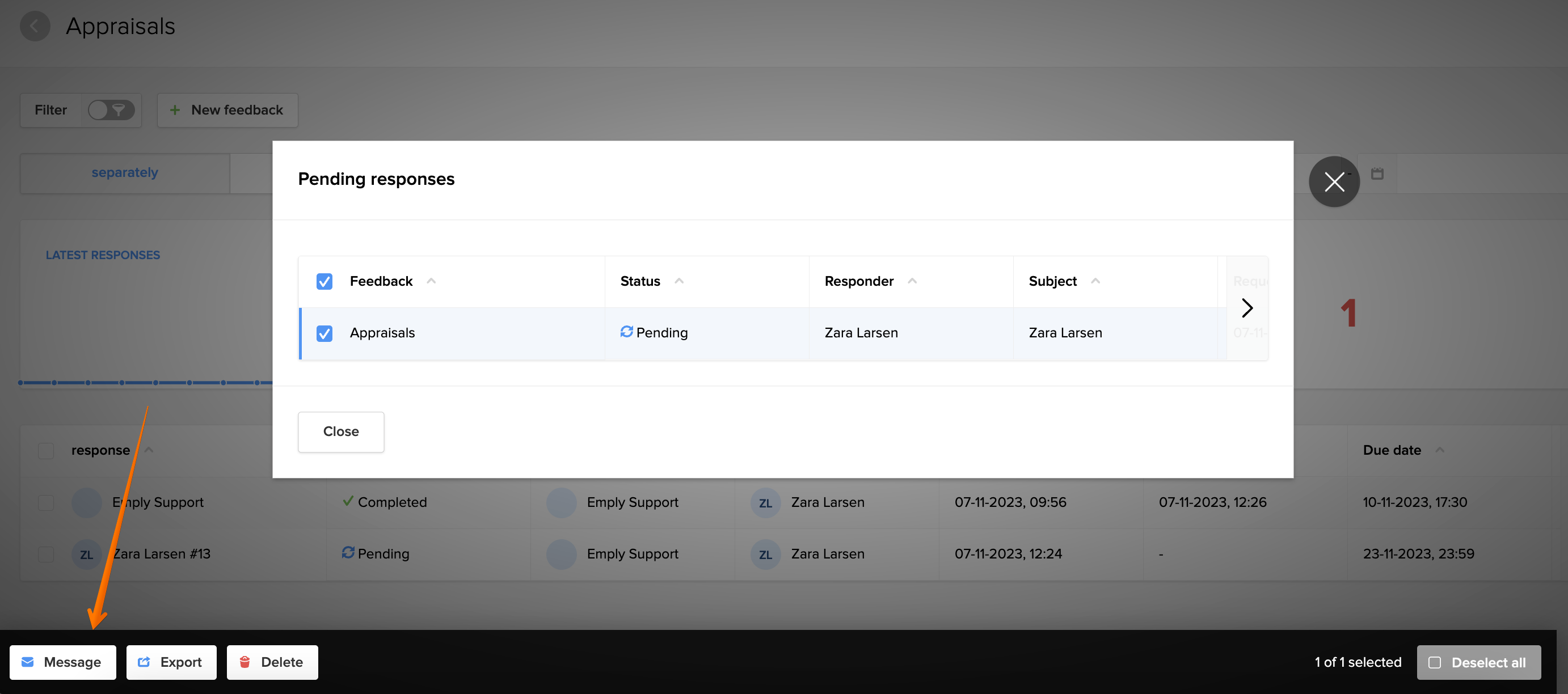 If you have a feedback, where one or several have not responded to their feedback, you have the option to send a manual reminder to one or several of the feedback receivers who have not responded. Click on the 'Pending responses', and choose which ones to send a reminder to, and click 'Messages'.