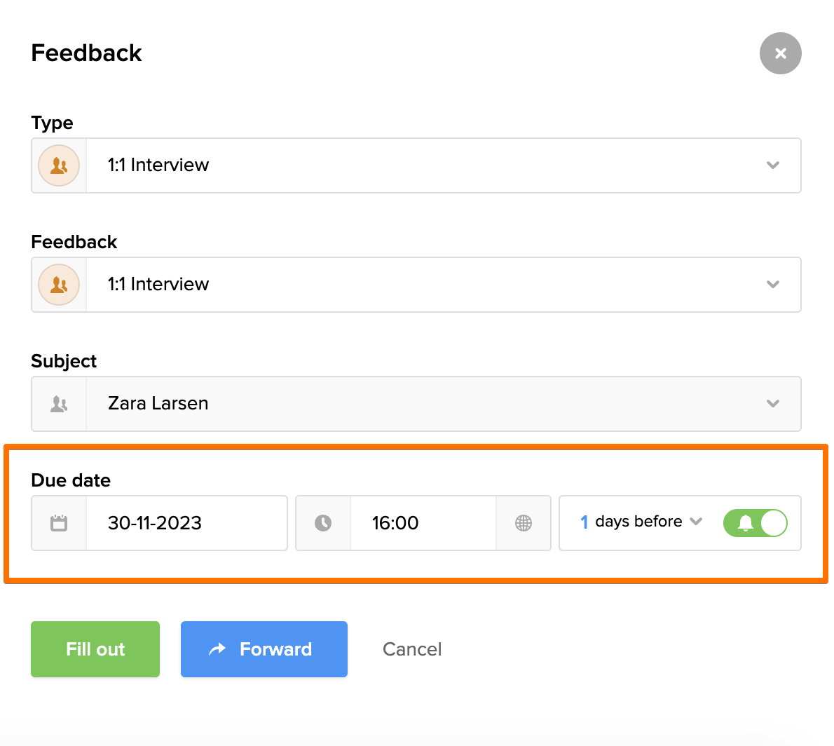 It is now possible to add a due date when forwarding a feedback form to a candidate, an onboarding profile or an employee. This is possible both for forwarding to a single profile or in bulk.