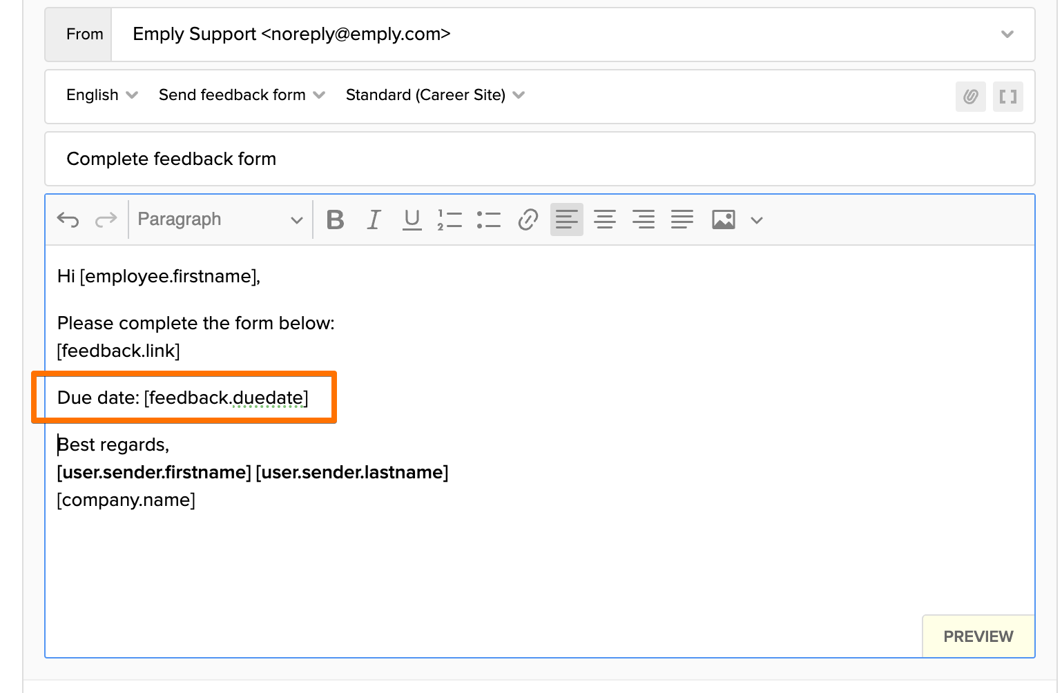 When forwarding the feedback with a due date, make sure to enter the keyword [feedback.duedate] in the message template, so it is clear for the receiver when the feedback is due.