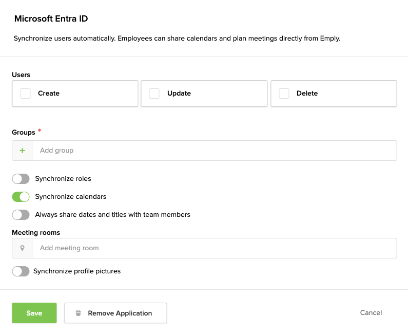 Enabling this will synchronize the Outlook calendar with Emply, and give you the opportunity to add meetings rooms. The 'Always share dates and titles with team members' tick will only appear when enabling this functionality.