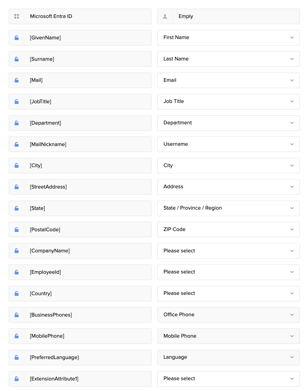 15 extension attributes can be mapped. These attributes do not send data directly to Microsoft Entra ID, but allow you to create code that adds these attributes to a specific property in Microsoft Entra ID. Emply does not support.